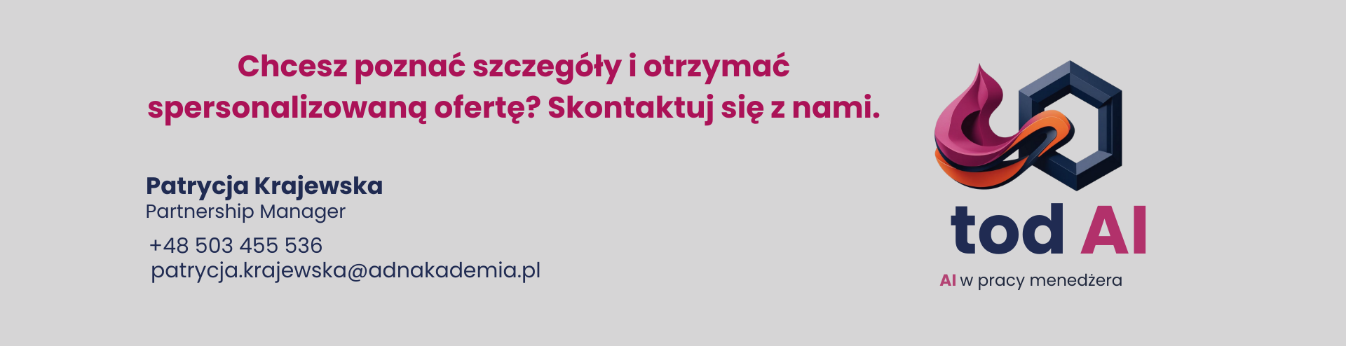 Konferencja „todAI. AI w Pracy Menedżera” to unikalna platforma do spotkania z decydentami, którzy aktywnie poszukują innowacyjnych technologii i partnerów do transformacji swoich firm. Zaprezentuj swoją markę i ekspertyzę w centrum najważniejszej biznesowej rozmowy roku.